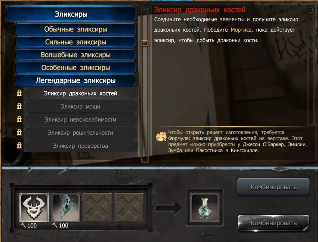 Для разблокировки рецепта требуется Формула: эликсир драконьих костей, её можно купить у таких торговцев как: Эмилия, Зубмо, Пакостник и Джесси О’Баркер.